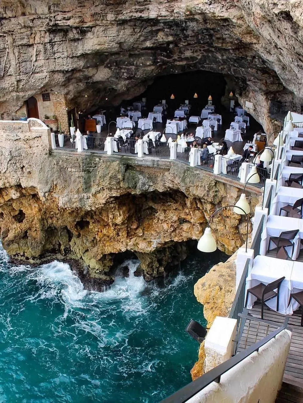 大量的海岸洞穴是这个古老小镇的特点,Grotta Palazzese是其中的佼佼者。这个海边的悬崖洞穴在17世纪是贵族的活动场所,法国画家Jean Louis Desprez的画作View of the Grotta di Palazzo with Banquet 就描绘了当时的盛景。悬崖上方现在已盖起了酒店,而洞穴本身成为酒店餐厅,延续着300多年前的觥筹交错。