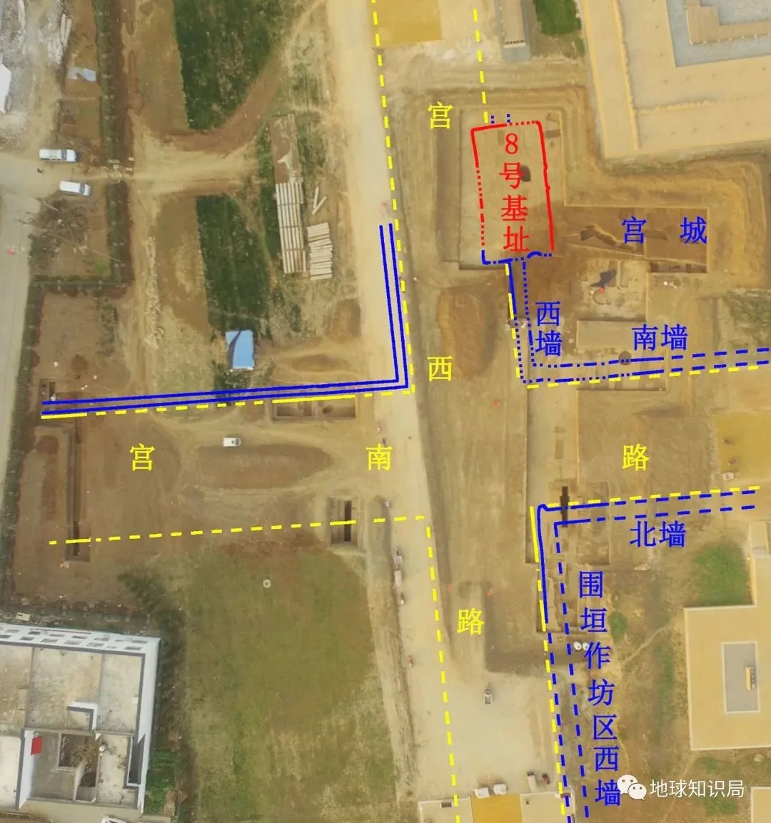 新发现宫北路上的门道,宫城以西区域围墙的东南拐角,东南角近直角,内侧被破坏较多;新发现宫西路向北延伸200余米,道路的东西宽度约16米,道路两侧均有宽约2米的南北长条形夯土墙。东侧的夯土墙,应为祭祀区西侧的围墙;西侧的夯土墙,应为祭祀区以西区域的东侧围墙。