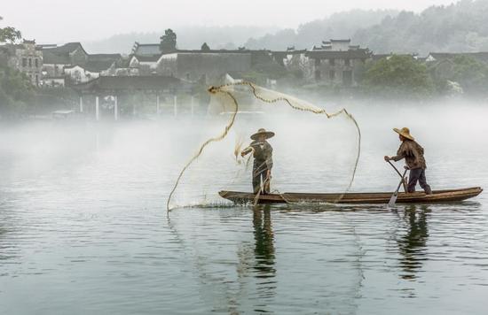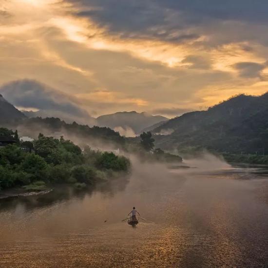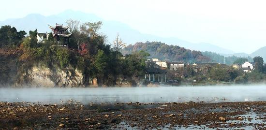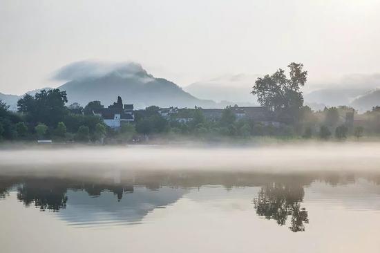 岁暮时节的桃花潭呈现出了特有的悠闲与宁寂,晨光里潭面风静纹平,水雾如烟,清凉的空气托着犹如白丝绸一样的云雾,缭绕在群山之中,迷蒙了四野,削淡了色彩。