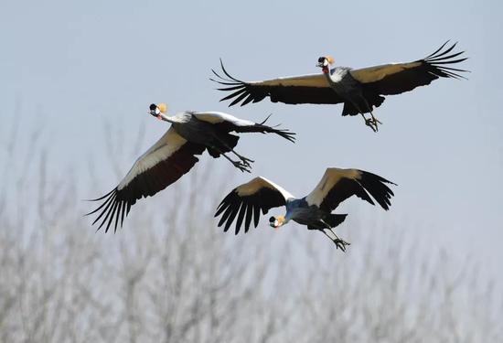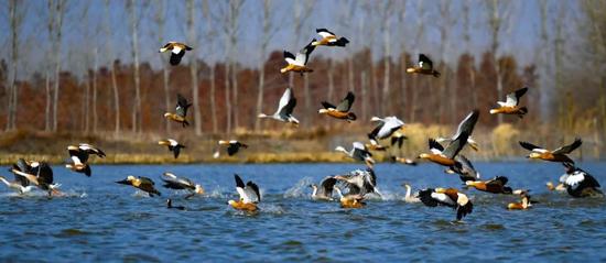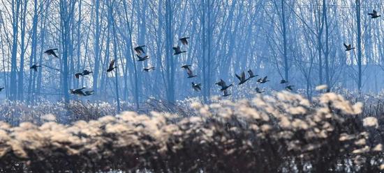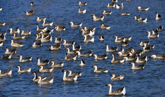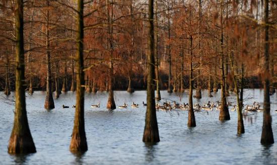 鸟类在池杉林里穿梭,大雁、野鸭、黑天鹅等鸟类在这里和谐共处。