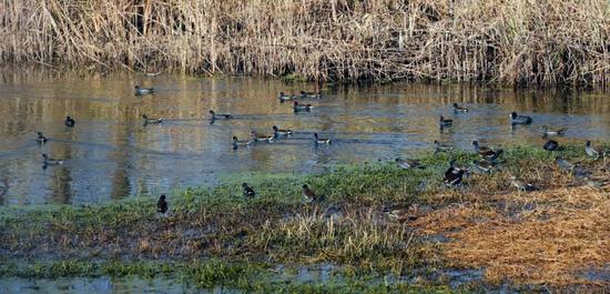 体格娇小的黑水鸡成群地出现在面积较小的湿地。