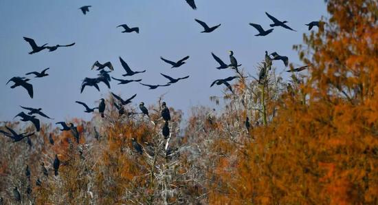 每到秋冬之际,数万只鸬鹚从北方飞来过冬,十分的壮观。清晨的池杉林,静谧而祥和,各种鸟类的叫声仿佛是生命之歌。