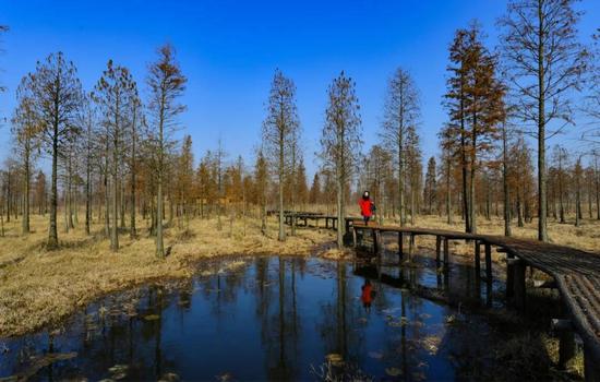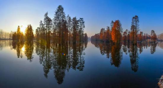 澄澈的千亩湖面上,数万池杉树影婆娑;夕阳的金黄余辉中,成千上万只候鸟归巢!入冬后,在位于滁州来安雷官和南京六合程桥交界处的池杉湖湿地公园,这样动人的画面日日可见。