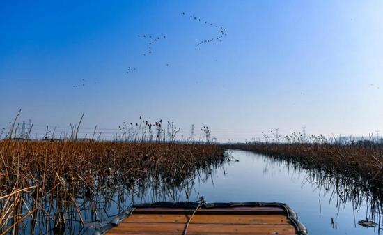 小船穿梭在湿地,远处天空的鸬鹚成群从头顶飞过,外出觅食。