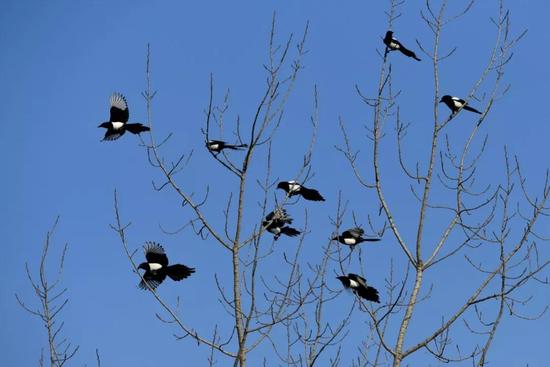 池杉湖里的杨树上,是喜鹊做窝之地。