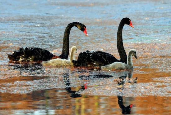 两只黑天鹅在另一片池杉林里孵出一对小天鹅。
