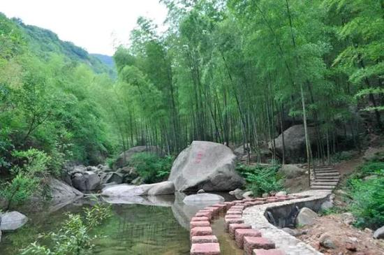 龙井沟风景区长约2500米,瀑布迭岩绵延,两岸峭壁林立,河床弯曲有致,怪石千姿百态,翠竹遮天蔽日,树木凿石而生,堪称国家大别山地质公园的浓缩版。