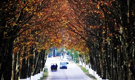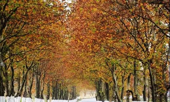 全椒太平庵至古河镇,30公里的331省道两旁,清一色五十年树龄以上的法国梧桐树,根部刷上洁白的石灰印迹,伸展开巨大的树冠,环抱着黑色的沥青通道。其中,何庄至尹村二公里的道路段,分布得最为密集:叉与叉、叶与叶在蓝天中,跨过道路而交错在一起,簇拥成“梦幻四季隧道”。