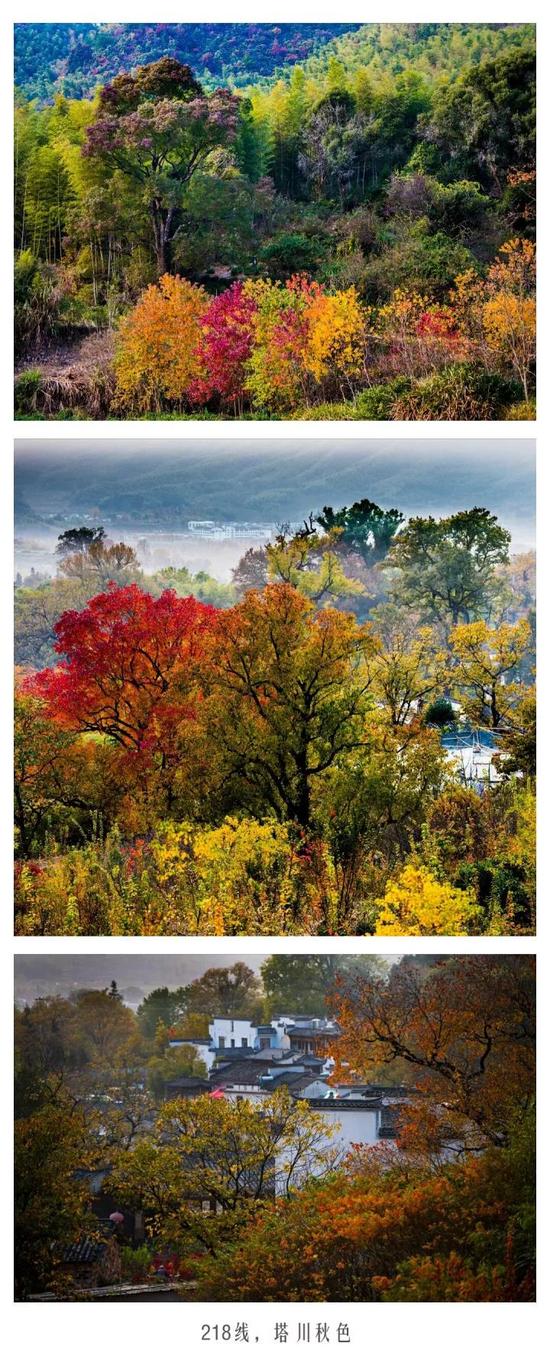 其实,走一趟S218,你才能领略到什么是秋色无边,行走在山路上,在溪流边,在古村旁,五彩的皖南之秋无所不在,或极目远眺,或登高俯瞰,万千秋景,尽入眼帘。路在延伸,而转角就是另一番奇观。