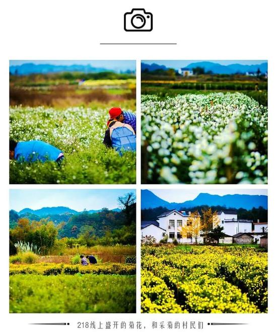 S218对秋的定义更远不止几片红叶,掠过西递,大片的菊花,正在盛开,金黄的树,白色的菊,黑墙白瓦的徽式古村,会让你看得发呆,难掷一言。
