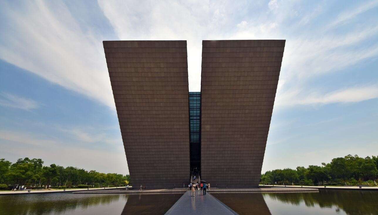 从名人馆出来,穿越马路就是渡江战役纪念馆了,纪念馆由南向北依次为五角星胜利塔、总前委群像和纪念馆。整个渡江战役纪念馆造型独特,巨大的馆身犹如两艘雄伟战舰并排行驶在浩瀚的水面,向前直指南方的长江。整体呈锐角三角形向前倾斜的造型气势轩昂,让人叹为观止。