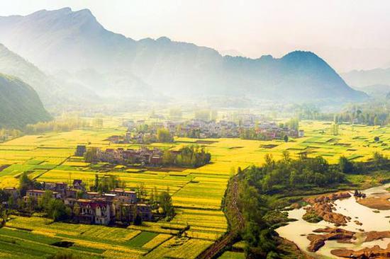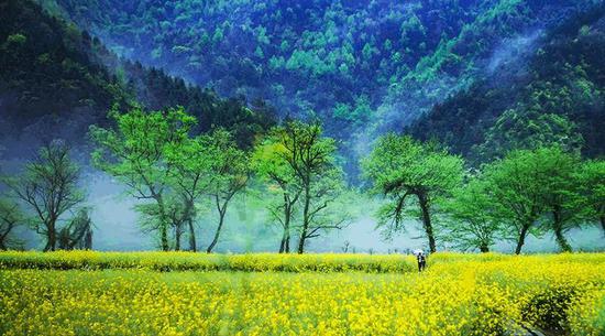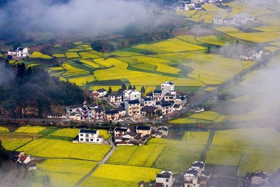 石潭油菜花海广泛分布在山坡上、梯田里、河畔边,犹如立体的画卷。沿着新安江上游,雄村、桃花坝、深渡、绵潭、南源口、石潭一路下来,都是油菜花开的盛景,可谓徽州“油菜花走廊”。乡村山水间飘渺着的朦胧雾纱、古意盎然的民居、石径、廊桥,青山绿水环绕其间,全然剔透着一派水墨丹青的韵味。网络图
