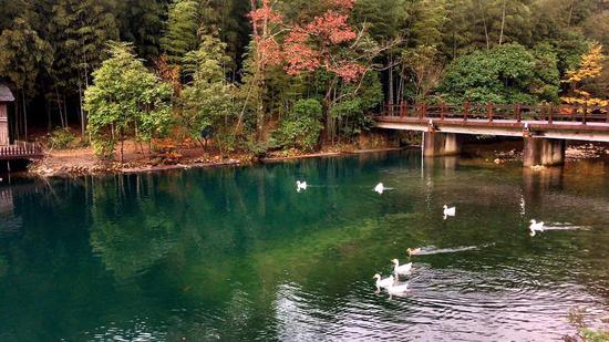 第二天一早,大家一起围坐在牯牛湖边,几只白鹅、一群锦鲤,惬意无比!