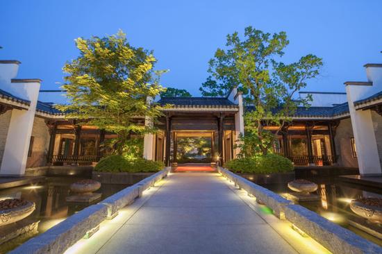 酒店的整体风格以现代中式设计为题,融合了传统徽派风格,马头墙、小青瓦。建筑依山就势,集古雅、简洁、富丽为一体。一步一风景堪称桃源。