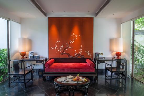 房间的整体设计,洋溢着古朴的中式风格,结合院内的花草树木,显得一切格外轻快别致。