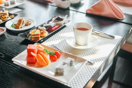 第二天清晨,伴随着小雨的滴答声醒来。打开房门,新鲜的空气扑面而来。雨天把整个酒店拉入了烟雨朦胧中。洗漱完,你可以拨打一键服务让专属管家送你去吃早餐。