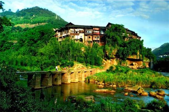旧时的丙安,由于地势险峻不能通陆路,抵达的唯一方法是行船,宛如孤岛上的古堡。而现在那通往北岸的吊桥也是新建的,站在吊桥上遥望古镇,惊觉这竟是建于一块大石头上的古城。古城之上那沿河而建的,全是鳞次栉比的吊脚楼风格建筑,经千年风霜仍稳如磐石,不得不惊叹于古人那高深的建筑艺术,被誉为“明清建筑与历史的活化石”。