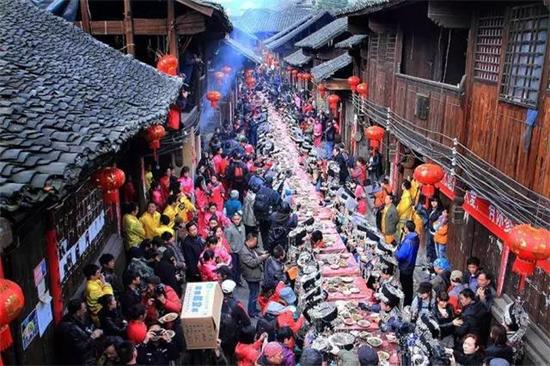 腊月里,居民都纷纷拿出自己筹备的年货美食,沿街设下宴席,招呼来自远方的亲朋好友,场景好生热闹。近年为延续这样的传统,每年正月十三,寨英古镇在举行滚龙灯会的前后也会设下”长街宴“,在招待国内外游客的同时,也迎来了更浓烈的年味。