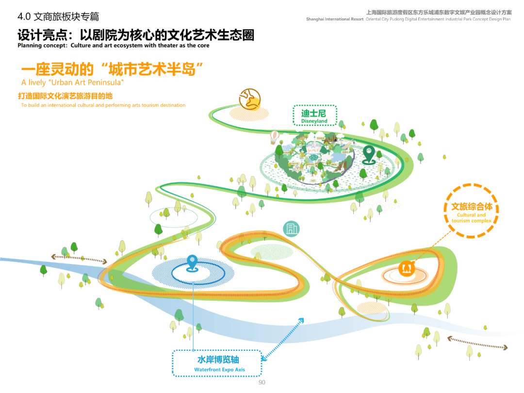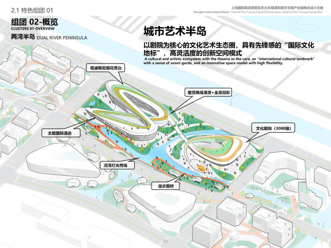 2. 两湾半岛:整合艺术剧院、演艺中心与主题酒店,形成文化核心。