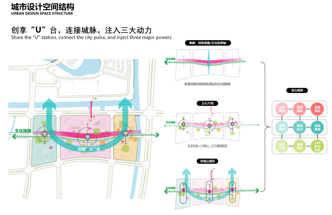 - 创享“U”台概念:通过城市绿轴连接五大空间组团,注入三大动力(创新、体验、生态),形成产业联动网络。