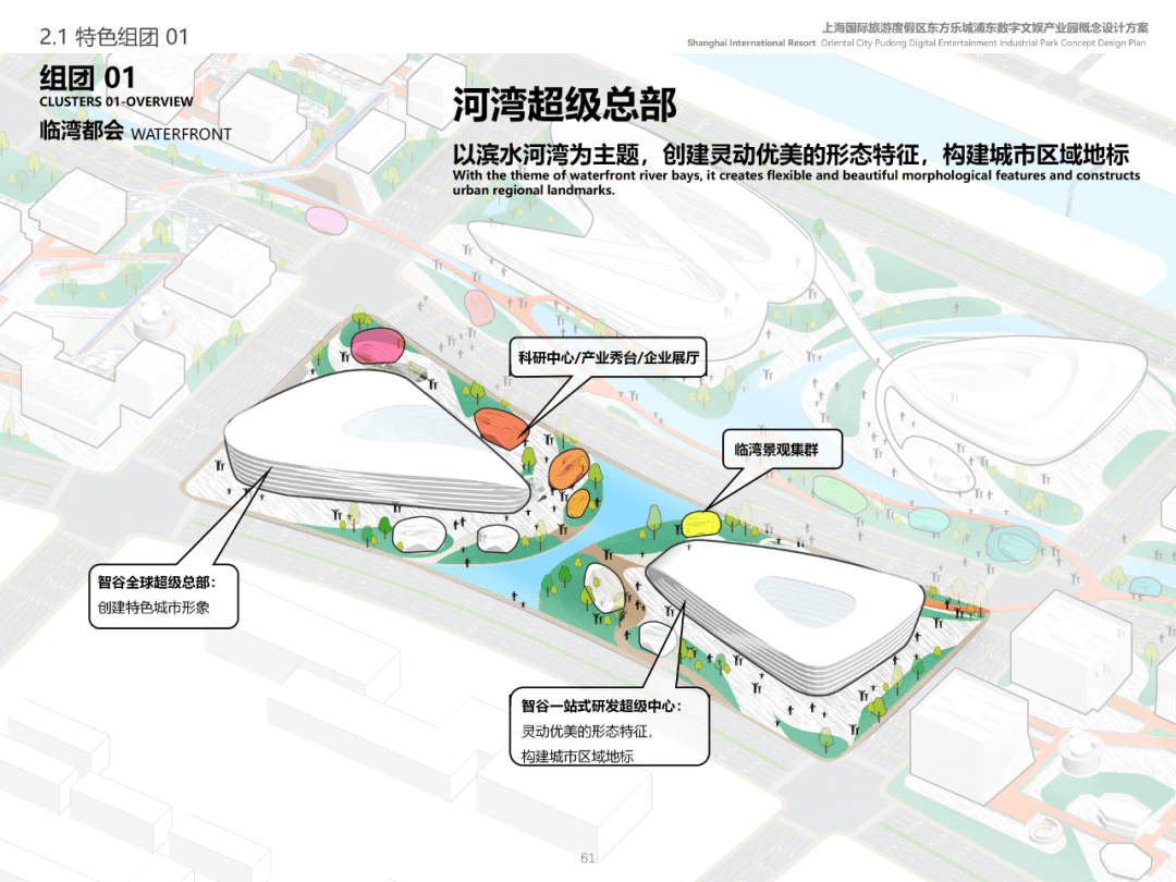 1. 临湾都会/超级数字总部:聚焦数字文娱企业总部,打造地标性建筑。
