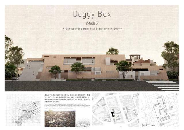 - 设计主题与问题解决:设计主题是在天津五大道湖南路东侧一块四千余平米的场地上设计一个城市历史街区特色民宿。针对场地附近周末和节假日小摊小贩多,影响道路交通和游览体验的问题,本设计试图将部分摊贩引入场地,成为民宿特色的一部分。