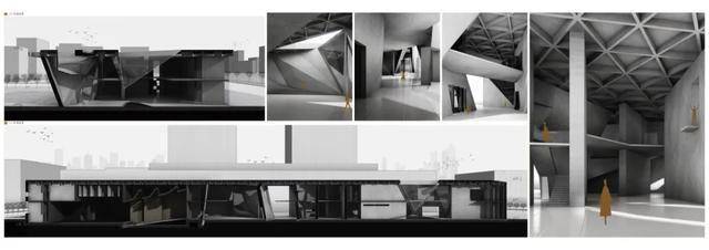- 立面与屋顶设计:立面上直接通过选择三角形块面的虚实,做较大的玻璃幕墙,消解大体量的厚重感。设少数屋面上人区域,主要为观景作用。同时三角井字梁的结构部分暴露在外,打破屋顶“大”而“平”的无聊感。