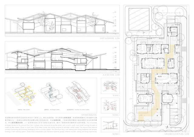 - 系统体系形成:在解决两大主要问题的过程中,自然形成了三大系统体系。首层横向排列的体块在临街处形成多个街巷入口,南北向再贯通一条主街,形成街巷系统;二层通过连廊实现民宿楼与楼之间的通达性,形成连廊系统;三层通过屋顶漫游步道连接散布各处的屋顶露台,形成屋顶漫游系统。三个系统相互独立又彼此交流互动,提升了旅客的游览趣味性与居住体验。