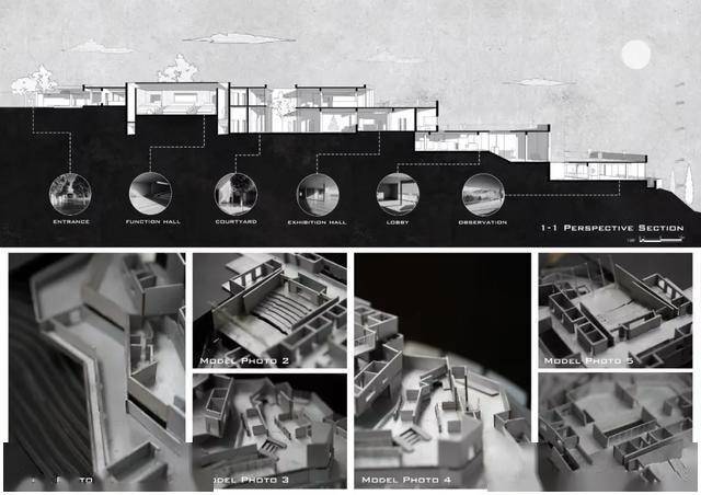 - 设计主题与感受转化:本设计是为美国怪奇小说家H·P·洛夫克拉夫特的作品“克苏鲁神话” 系列设计的定制化艺术中心。设计从洛氏作品中提取了三种最为核心的感受:对天文学与宇宙的热爱与思考,对故乡、童年的怀念与幻想,来自人生经历的不被认同感,将这三种感受转化为空间原型并组织起来,形成三个主题展厅,分别展出洛氏手稿、其他艺术家为其创作的画作、雕塑等。