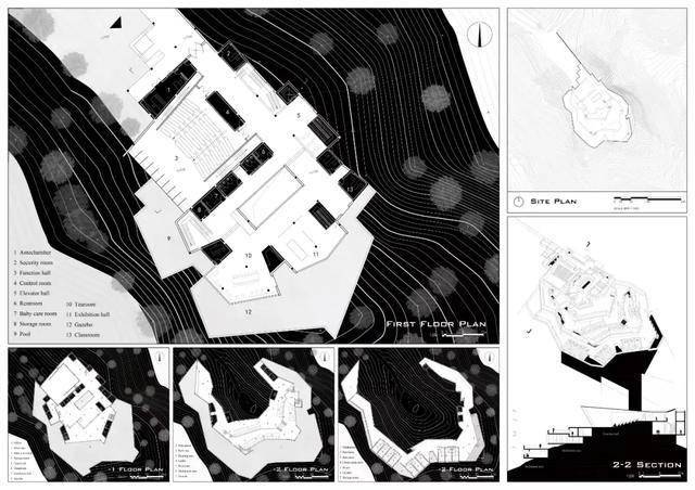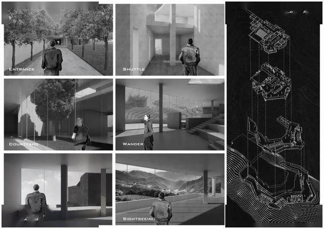 - 建筑形式与空间划分:为契合山地特征,本设计采用等高线屋面的形式,部分建筑嵌入山体,屋檐出挑形成灰空间,延续山地走向并吸引人流进入。入口处巨大水院扩大静谧感,为使用者带来强烈视觉冲击,周边亲水平台满足城市客厅的聚集性和休憩功能。建筑内部通过山地高差配合庭院划分空间,主要功能包含演奏厅、小型餐吧和展览区等。自由曲墙赋予空间流动性,混凝土墙面和植物配合光照“物化”时间,居民行走在建筑内部时可通过光影变化沉浸式感受空间丰富性。