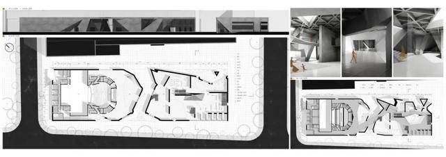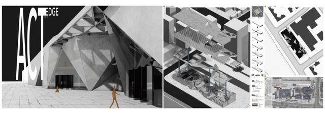 - 设计灵感与体块处理:本建筑灵感源于海河,试图用石头的意象来回应环境,于是在整体体块上进行三角切削,将石块抽象化。同时考虑剧院散场景观,将其置于视野更开阔一侧。另一侧将功能的氛围与环境作为底层逻辑,对不同功能区作了位置的定位,在体块内置入大体量片墙、不设房间,仅置入部分小体块作为辅助空间,意在营造一个流动而通透的“客厅”环境。