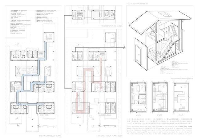 - 房型与公共空间设置:结合坡屋顶设置了四种不同类型的房间,分别是带Loft的单人间、普通双人间、带Loft的双人间、带Loft的三人间。在民宿内部设置了不同类型的公共空间,如带阅读角的客用洗衣房、共享厨房与简餐区、健身空间、屋顶露台、漫游步道等,保证了民宿的私密性、空间趣味性与社交功能。