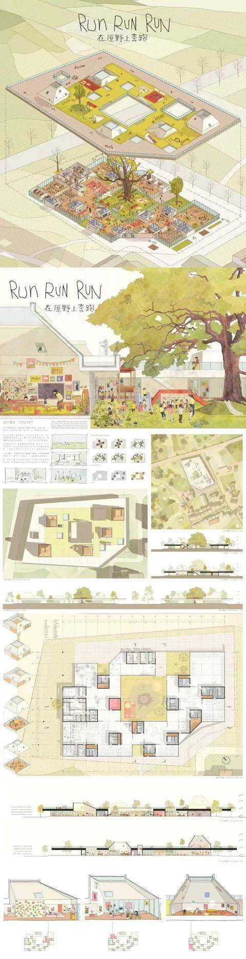 - 家:结合儿童对于家的构想以及传统的坡屋顶民居建筑,利用坡屋顶的变形创造家的空间意向。