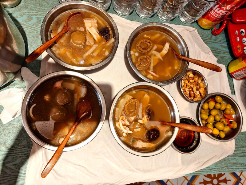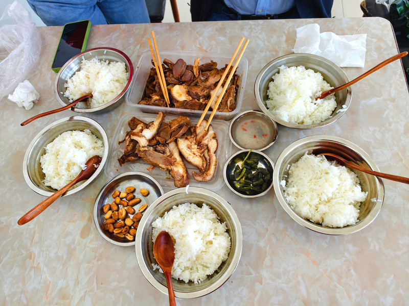 对于解决一日三餐这个每天都要面临的问题,我们主要做法,一是早餐就吃酒店送的早餐,虽菜品有时会比较单一,但吃饱没问题;二是午餐如果在路上,为节省时间,大多会充分利用随车携带的户外电源、电冰箱和电饭煲,自己做饭吃,快捷省事。如果在景区或其它地方,则找个小餐馆或卖小吃的地方,随便应付一餐也不难;三是晚餐就稍为讲究一点,现在的城镇一般都能找到档次好一点或有地方特色的餐饮,方便的时候也会自己动手做些适口的饭菜。这样一来较好解决了旅途上饮食的问题,在享用美食、犒劳自己的同时,也使因长途自驾消耗量很大的体能得到有效的补充。