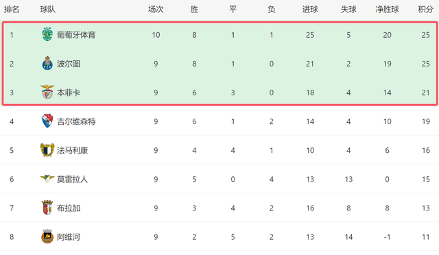 - 葡萄牙体育积25分,反超少赛一场的波尔图(24分),升至积分榜首位。