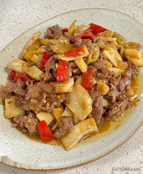 2. 热油滑熟牛肉盛出,杏鲍菇煎至金黄