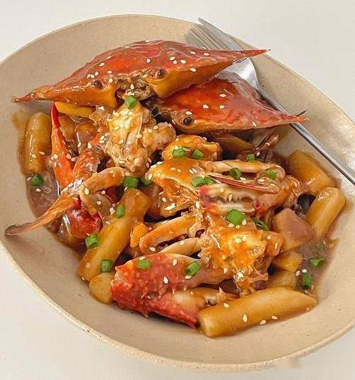 准备食材:梭子蟹、年糕、青椒、红椒、洋葱、姜、蒜、小米辣。