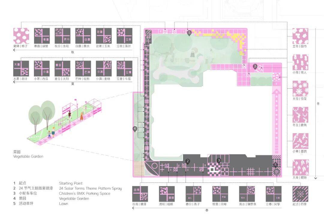 2025年5月上旬,我们结合该幼儿园“玩+”的教学理念,提出了“飞行棋幼儿园”的整体设计理念与具体方案。方案以“飞行棋盘”为原型结合幼儿园场地现状的投射与变形形成了整体空间结构,并结合原型棋盘中的“4色路径”进行特征景观设计。其中:将蓝色路径设计为蕴含奥林匹克运动项目科普的“强国之旅”,以学前教育对幼儿运动的重视;将绿色路径设计为包含食物链、自然生态位科普的“自然之旅”,并与相邻空间保留的水体、沙地等功能区相协调;将浅紫色路径设计为体现中国传统“二十四节气”的季候认知的“时间之旅”;将黄色路径设计为具有宇宙科普主题的“宇宙之旅”。后二者共同构成的时空探索主题也是对该幼儿园在科技启蒙特色方面的响应。最后在场地外围,结合现状绿地空间与保留大型儿童攀爬游乐设备下方,我们在延续田林公园中的地景式自然生境营造方式的基础上,通过设立生境观测点、优化林下绿化等方式,为幼儿园的户外探索活动创造了丰富的体验空间。“飞行棋幼儿园”的整体设计对于园方的初始诉求而言无疑是一次重命题,但从该幼儿园的教学特色与理念看,却是更好的建构了幼儿教学的户外趣味图景。