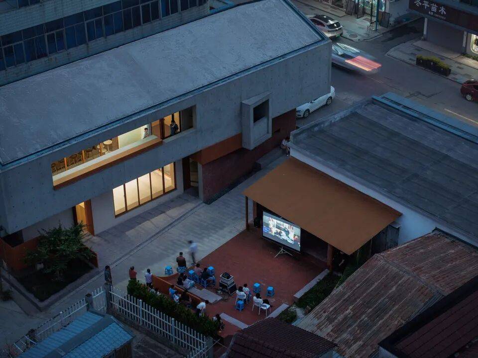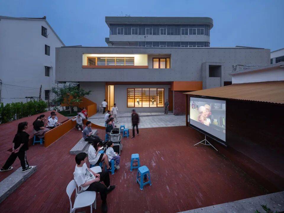 小院日常可供村民歇息或孩童们嬉戏,也可以作为一层茶饮的外摆空间。红砖材质的选用呼应了集镇上有着历史的水塔,留下一些传统生活与市井文化的印记。村镇定期会在这里放映露天电影,举办小型演出,丰富新亭桥集镇街道的文化生活。