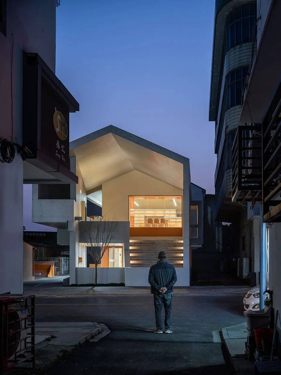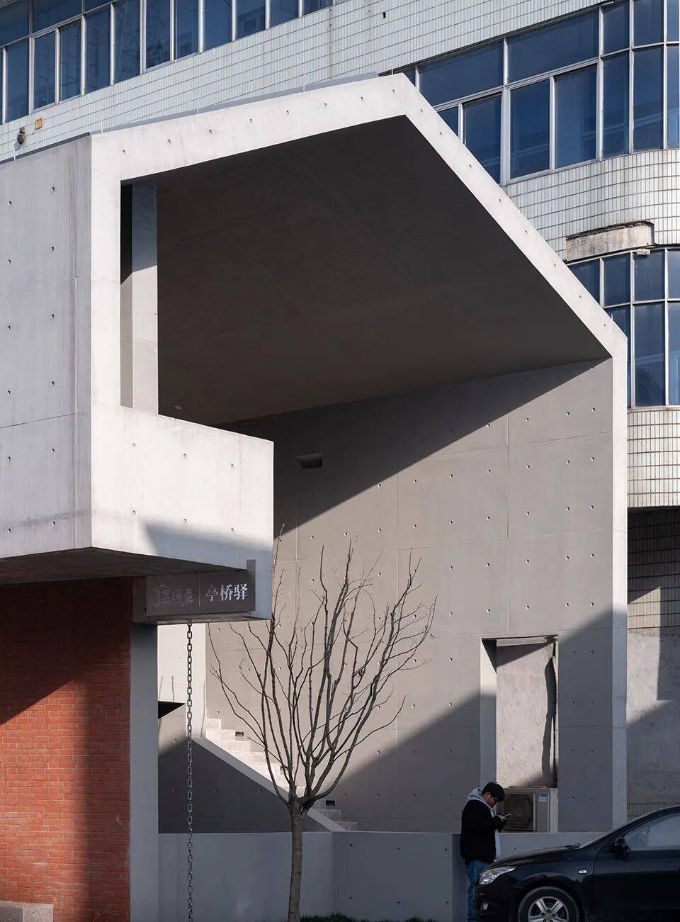建成后的驿站是亭桥街道唯一直接沿街的公共建筑。不同于常规的商业界面,设计有意将书吧和茶吧功能后置,不直接暴露于街面。建筑立面变成公共空间的一部分,打开的立面成为人行步道的扩展与延续:开放的大楼梯朝向街道,既在平面上隔绝了外部车行对于一层活动空间的影响,又在垂直方向上指引至二层的书吧。立体的院落与平台交织于建筑的形体之中,成为街区立面上有趣的公共休闲空间。