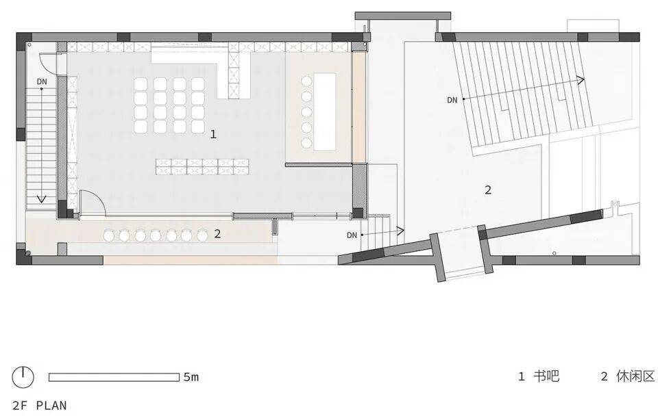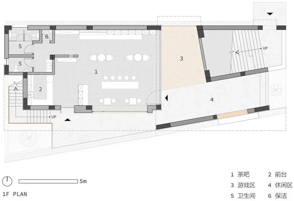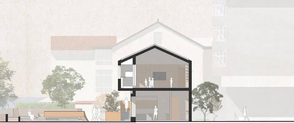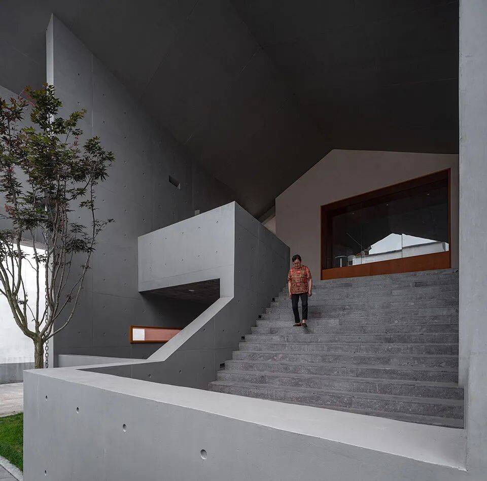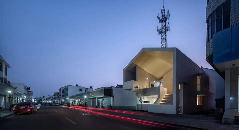 - 无立面的房子:亭桥驿作为沿街公共建筑,将书吧和茶吧功能后置,不直接暴露于街面。建筑立面转化为公共空间延伸部分,开放的大楼梯朝向街道,在隔绝车行干扰的同时引导人流至二层书吧。立体院落与平台交织于建筑形体中,形成丰富的公共休闲空间。