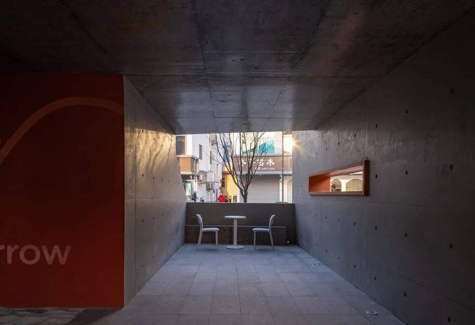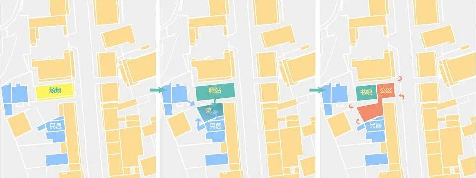 在传统的村镇中,广场、院落和街道几乎容纳了所有日常生活中的社交活动。单一模式化的街区整治与改造挤压了这些集聚的生活空间。设计希望打破较为封闭的沿街状态,让街道有一个”缺口“,产生不同的节奏与变化。倾斜的红砖墙提示人们可以走到街区的背面去发现一个“口袋小院”的存在,并参与到这个新落成的公共场地中。沿街商铺的背后原有一个雨棚,经修缮和粉刷后改建成了一个小舞台,相对应的院落边界则由一些地景式的座位区组成。