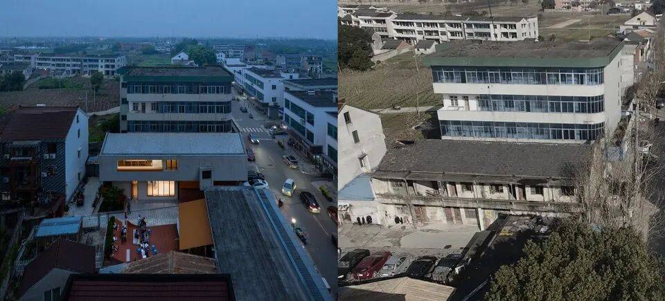 集镇建筑大部分建于八九十年代,近年来经历了一次街道改造。街道的修缮与形象提升本着基础建设为先,整治并行的原则,保证了街道界面的统一性。道路两侧业态均以商铺为主,门头+店面的形式贯穿了整条街道。改建前驿站的基地是一栋两层高的老建筑,仅店面宽度的山墙面向马路,需通过一条小路折进建筑的入口,南侧有一个杂院被遮挡在沿街建筑身后,三面都被民居和商铺所围合。