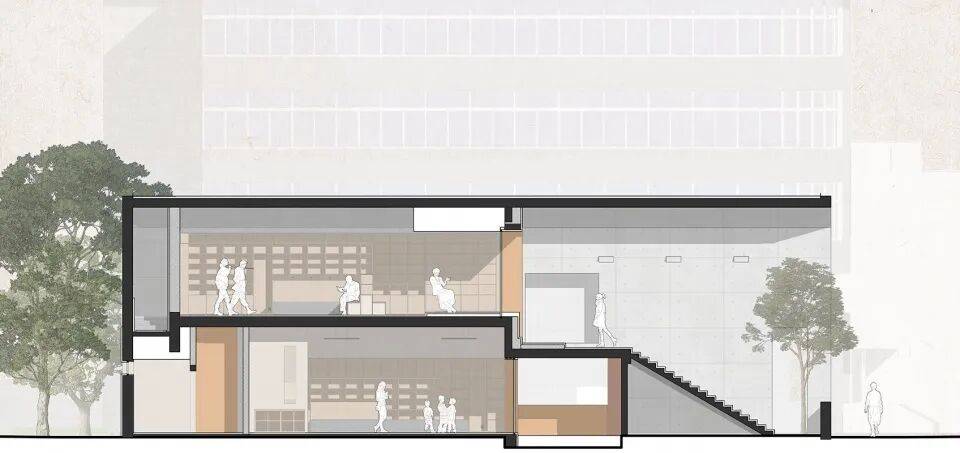 借鉴古驿站的空间序列,通过坡道替代楼梯串联各功能区。坡道侧壁嵌入采光缝,光影随时间游移,标记“驿程”的流动感。