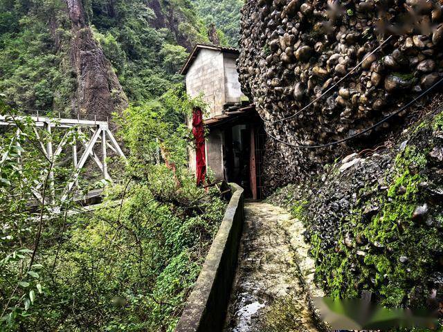 在隧道中间的空隙中行走,抬头只见上面的寺庙,四周壁立,让人感慨。