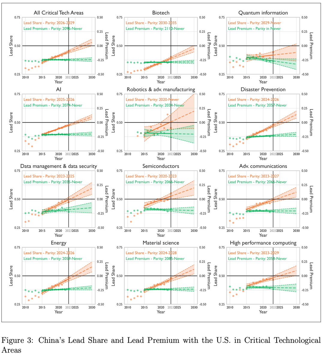 唯一的例外是机器人与先进制造领域,由于数据较少,预测尚不确定,但大趋势无疑是中国在绝大多数前沿技术赛道上都在迅猛逼近领跑集团。