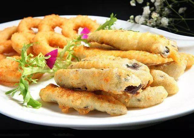 3.将酿辽参挂上脆浆,入六成热油锅中炸至金黄皮脆,捞起,升高油温后回锅再炸一次,捞出控油,撒七味盐,摆盘。