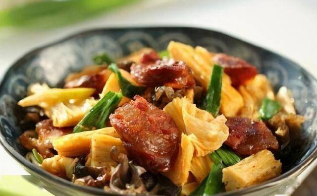 材料:腐竹、腊肠、木耳、蒜盐、味精