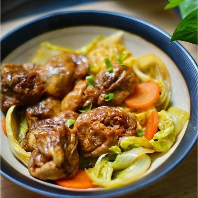 材料:大白菜 500克油面筋塞肉10个;油20毫升生抽20毫升盐3克 蒜瓣4个 葱花少许;
