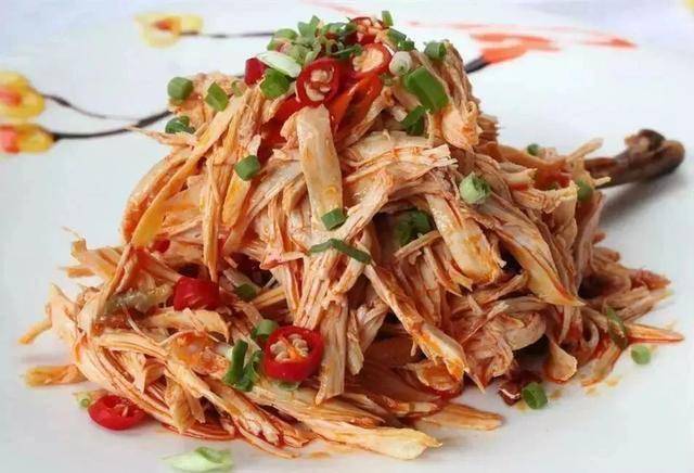 4、把凉透了的鸡用手撕成小条,加木耳,倒入调味汁拌匀。